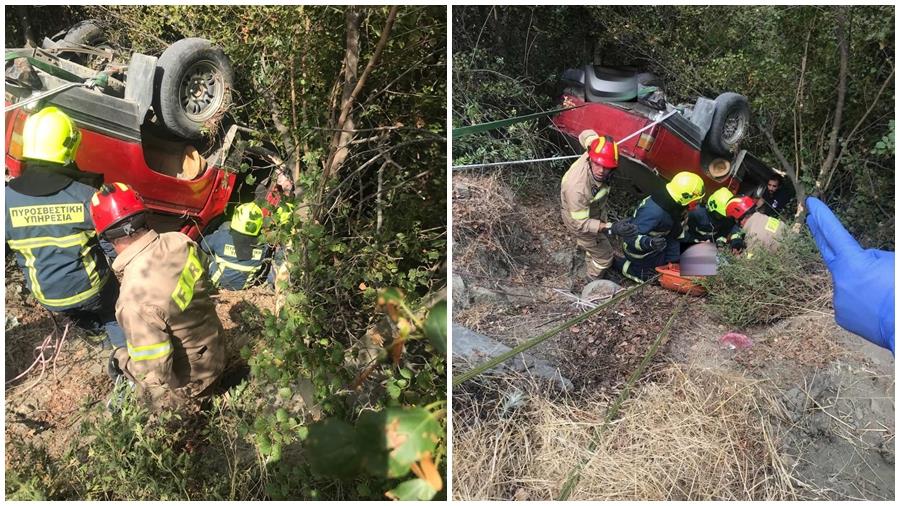 Διπλοκάμπινο όχημα βρισκόταν αναποδογυρισμένο σε γκρεμνό βάθους 5 μέτρων περίπου με 3 άτομα παγιδευμένα εντός. Στο όχημα υπήρχε και τέταρτο άτομο (ο οδηγός) ο οποίος βγήκε πριν την άφιξη της Πυροσβεστικής Υπηρεσίας.