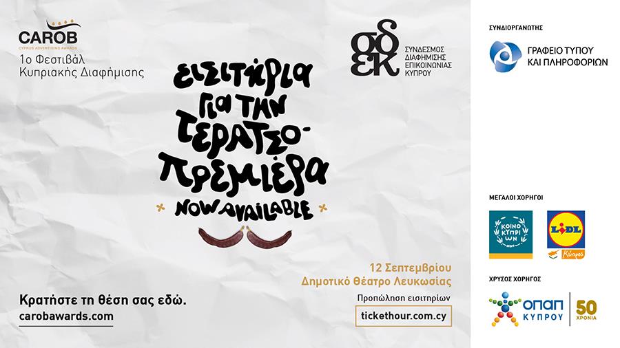 Τα CAROB Awards, τα πρώτα βραβεία Κυπριακής Διαφήμισης, θα διεξαχθούν την Πέμπτη 12 Σεπτεμβρίου 2019, στο Δημοτικό Θέατρο Λευκωσίας, η ώρα 19:00. Προμηθευτείτε τα εισιτήρια σας τώρα στο tickethour.com.cy!