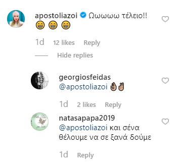 Τα βλέμματα μάλιστα τράβηξαν τα σχόλια της Μαρίας Σολωμού και της Αποστολίας Ζώη στην εν λόγω ανάρτηση, οι οποίες έδειξαν τον μεγάλο τους ενθουσιασμό.