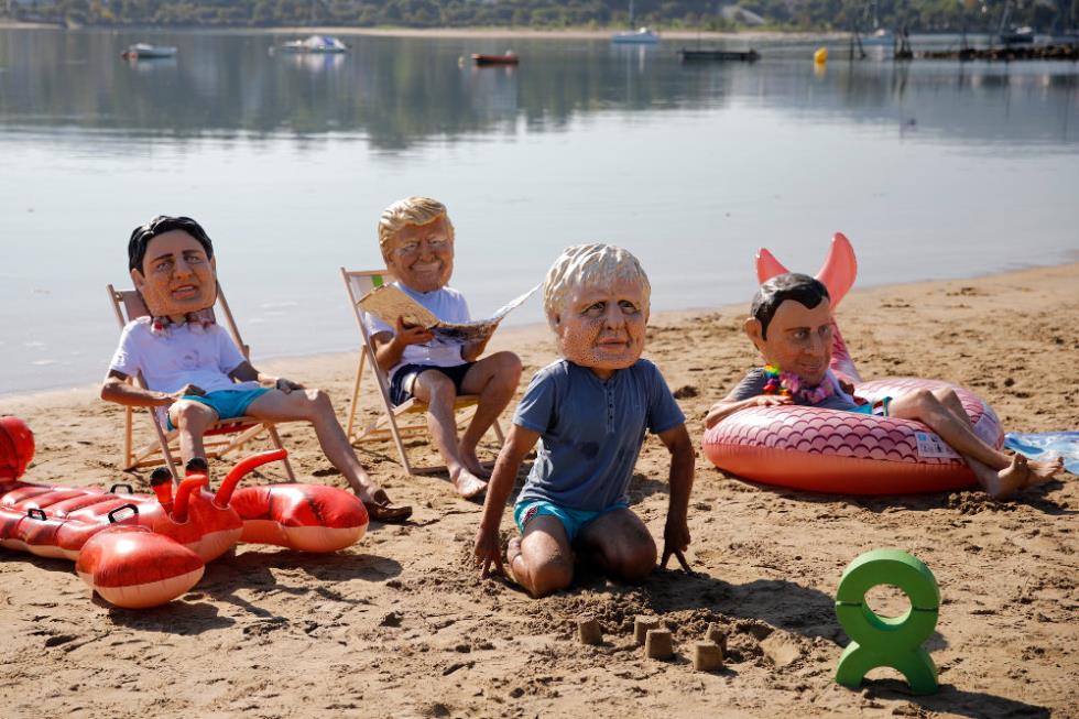 Η μεγάλη αμμουδερή παραλία της πόλης Μπιαρίτς έγινε ο καμβάς διαδηλωτών που ζωγράφισαν τα πρόσωπα των 7 ηγετών που συναντώνται στη γαλλική πόλη που φιλοξενεί τη Σύνοδο G7.