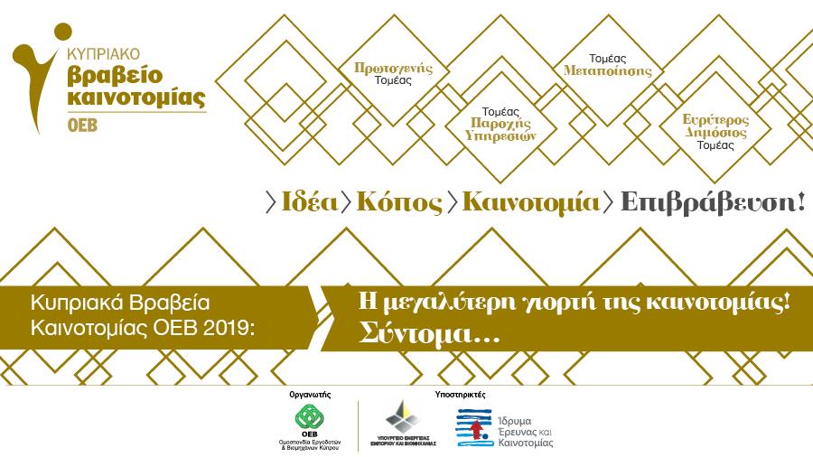 Εδώ και 13 συναπτά χρόνια, τα «Κυπριακά Βραβεία Καινοτομίας ΟΕΒ» επιβραβεύουν κι αναδεικνύουν επιχειρήσεις, οργανισμούς και υπηρεσίες του ιδιωτικού και ευρύτερου δημόσιου τομέα που κατάφεραν να ξεχωρίσουν χάρη στις καινοτόμες ιδέες και πρακτικές τους. Όπως κάθε χρόνο έτσι και φέτος, τα Κυπριακά Βραβεία Καινοτομίας της ΟΕΒ θα βραβεύσουν τέσσερις επιχειρήσεις/υπηρεσίες από τους εξής τομείς: Πρωτογενής, Μεταποιητικός, Υπηρεσίες και Ευρύτερος Δημόσιος Τομέας.