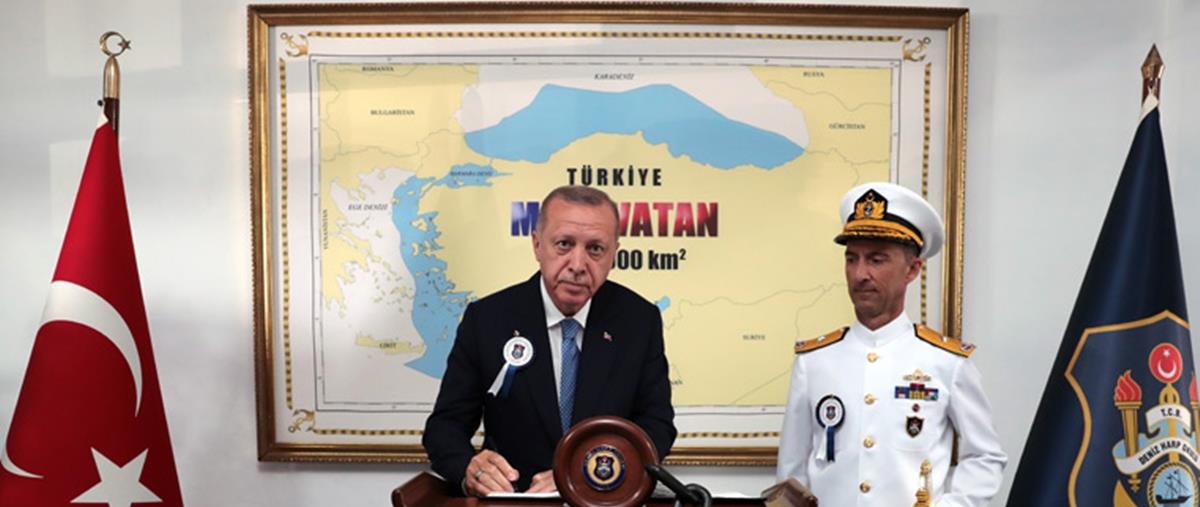 Σε μια φωτογραφία από την τελετή ορκωμοσίας στο Πανεπιστήμιο Εθνικής Άμυνας, εμφανίζεται ο Ερντογάν με φόντο έναν χάρτη που γράφει «Γαλάζια πατρίδα έκταση 462.000 χιλιομέτρων».