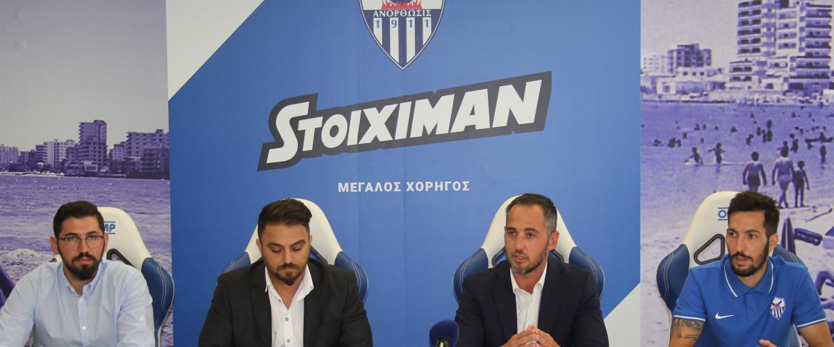 Δημοσιογραφική διάσκεψη παρέθεσε το μεσημέρι της Πέμπτης, 5 Σεπτεμβρίου, στην αίθουσα διασκέψεων Τύπου του «Αντώνης Παπαδόπουλος» η Ανόρθωση με σκοπό την παρουσίαση της στοιχηματικής εταιρείας Stoiximan, ως το μέγα χορηγό της ομάδας.