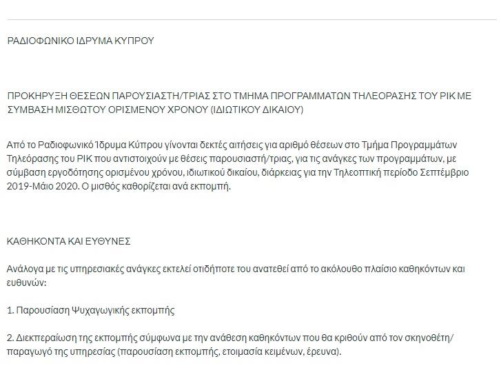 "Από το Ραδιοφωνικό Ίδρυμα Κύπρου γίνονται δεκτές αιτήσεις για αριθμό θέσεων στο Τμήμα Προγραμμάτων Τηλεόρασης του ΡΙΚ που αντιστοιχούν με θέσεις παρουσιαστή/τριας, για τις ανάγκες των προγραμμάτων, με σύμβαση εργοδότησης ορισμένου χρόνου, ιδιωτικού δικαίου, διάρκειας για την Τηλεοπτική περίοδο Σεπτέμβριο 2019-Μάιο 2020" αναφέρει ανάμεσα σε άλλα η προκύυξη θέσης.