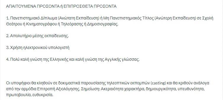Στην προκύρυξη θέσης, το ΡΙΚ αποκαλύπτει πως πρόκειται για παρουσίαση ψυχαγωγικής εκπομπής, ωστόσο δεν αναφέρονται περισσότερες λεπτομέρειες.