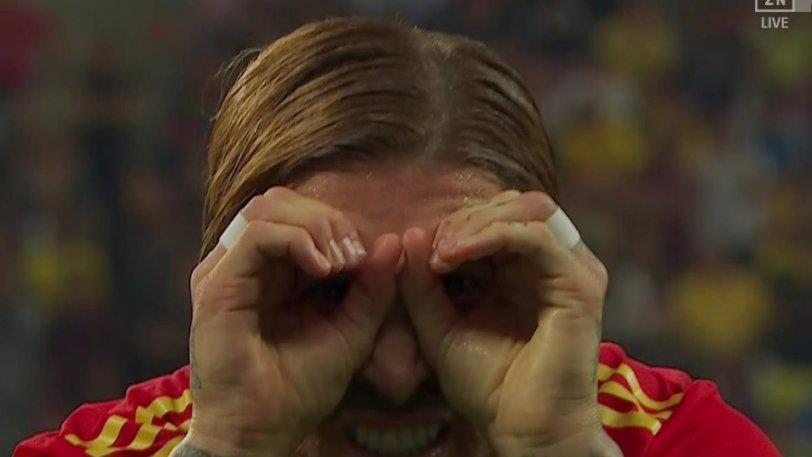 Πανηγυρίζοντας το γκολ που πέτυχε, με το οποίο άνοιξε το σκορ στη νίκη (2-1) της ομάδας του Ρομπέρτο Μορένο, πετυχαίνοντας ο ίδιος το 21ο του τέρμα με τη φανέλα με το εθνόσημο για να μπει και στο top-10 των σκόρερ όλων των εποχών, ο Σέρχιο Ράμος πανηγύρισε μπροστά στην κάμερα, σχηματίζοντας κιάλια με τα χέρια του.