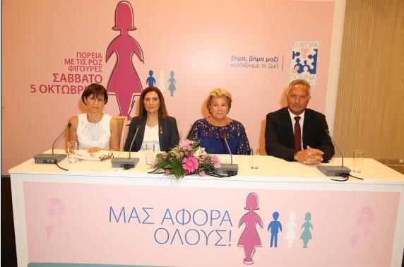 Σε χαιρετισμό της Προέδρου της Europa Donna Κύπρου, Στέλλας Κυριακίδου, τον οποίο ανέγνωσε η Αντιπρόεδρος, Στέλλα Μάστορα, η κ. Κυριακίδου ανέφερε ότι στις 5 Οκτωβρίου, «θα κρατάμε στα χέρια μας 575 ροζ φιγούρες που συμβολίζουν τα νέα περιστατικά καρκίνου του μαστού που διαγνώστηκαν σε γυναίκες, 6 γαλάζιες φιγούρες για τα νέα περιστατικά καρκίνου του μαστού που διαγνώστηκαν σε άνδρες και 135 λευκές φιγούρες που συμβολίζουν τον αριθμό των ασθενών που δεν βρίσκονται πια ανάμεσα μας. Για πρώτη φορά, όμως φέτος θα κρατάμε επίσης, 59 γαλαζοπράσινες φιγούρες, οι οποίες συμβολίζουν τον αριθμό των γυναικών που διαγνώστηκαν με καρκίνο των ωοθηκών».