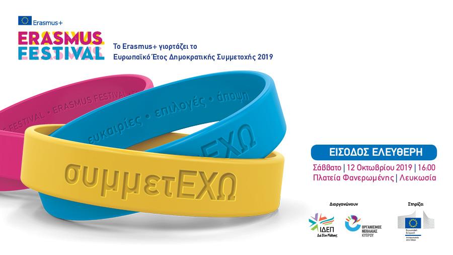 Για 3η συνεχή χρονιά, το ΙΔΕΠ Διά Βίου Μάθησης και ο Οργανισμός Νεολαίας Κύπρου, σε συνεργασία με την Αντιπροσωπεία της Ευρωπαϊκής Επιτροπής στην Κύπρο, σας προσκαλούν στο Φεστιβάλ Erasmus+ το οποίο διοργανώνεται στα πλαίσια της πρωτοβουλίας Erasmus Days. Ραντεβού το Σάββατο 12 Οκτωβρίου στην Πλατεία Φανερωμένης στη Λευκωσία, για να γιορτάσουμε μαζί το πιο πετυχημένο Ευρωπαϊκό Πρόγραμμα συνεργασίας και κινητικότητας στην Εκπαίδευση, την Κατάρτιση, τη Νεολαία και τον Αθλητισμό.