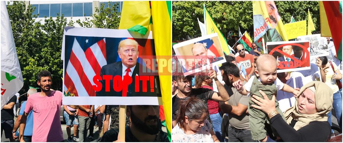 Οι Κούρδοι φωνάζουν συνθήματα κατά του Ερντογάν, ενώ καλούν κάθε δημοκρατική οργάνωση, κάθε δημοκράτη σε όλο το κόσμο να οργανώσει εκδηλώσεις για να καταδικαστεί και να εμποδιστεί η απρόκλητη επίθεση της Τουρκίας.