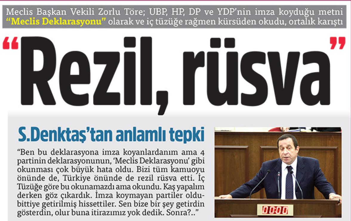 Η «Γενί Ντουζέν» (Νέα τάξη) με τίτλο «Ρεζίλι, ξεφτίλα» αναφέρεται στο τί έγινε χθες στη «βουλή» και παραθέτει αποσπάσματα από παρεμβάσεις των ομιλητών μετά το επεισόδιο με την ανάγνωση του κειμένου από τον Ζορλού Τορέ την ώρα που προήδρευε της συνεδρίασης της ολομέλειας. Αλλού αναφέρει ότι αποτελούν ντροπή αυτά που είπε ο Τούρκος πρώην προπονητής Αχμέτ Τσιακάρ για τον Μουσταφά Ακιντζί από τηλεοράσεως. Σε άλλο θέμα αναφέρεται στην ανακοίνωση του ΡΤΚ για την τουρκική επιχείρηση στη Συρία.