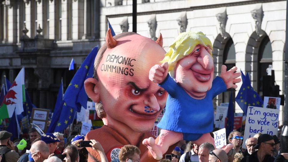 Μάλιστα, μία ομάδα διαδηλωτών έσυρε ένα σατυρικό άρμα το οποίο απεικονίζει τον Ντόμινικ Κάμινγκς, ο οποίος είχε διατελέσει διευθυντής της καμπάνιας του Brexit στο δημοψήφισμα, να κρατάει σαν κούκλα τον Μπόρις Τζόνσον.