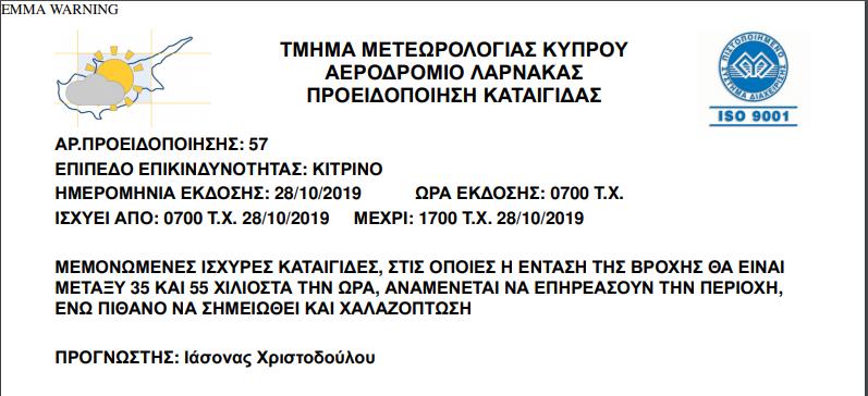 Παράλληλα, ενόψει της κακοκαιρίας, η Μετεωρολογική Υπηρεσία εξέδωσε κίτρινη προειδοποίηση.