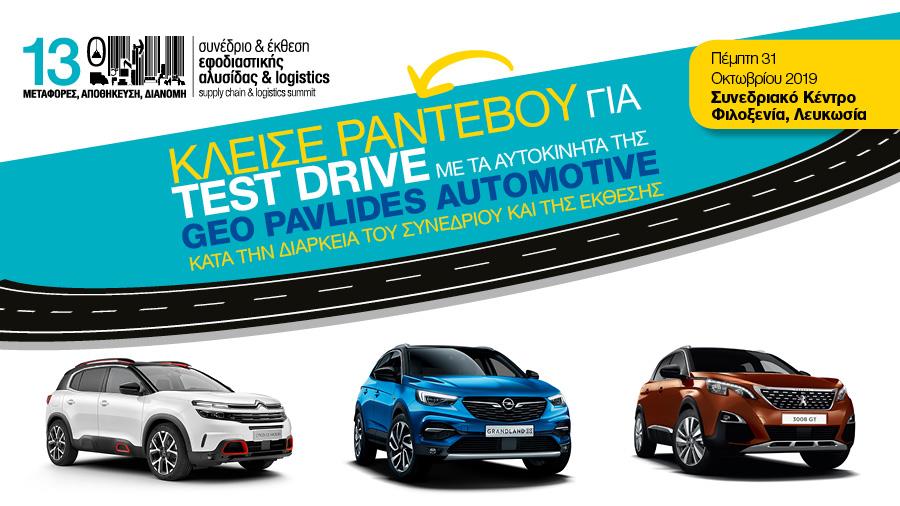 Ελάτε στο «13ο Συνέδριο-Έκθεση Εφοδιαστικής Αλυσίδας & Logistics», που θα γίνει αύριο, Πέμπτη 31 Οκτωβρίου 2019 στο Συνεδριακό Κέντρο Φιλοξενία, στη Λευκωσία, για να δείτε από κοντά και να οδηγήσετε τα αυτοκίνητα της Geo Pavlides Automotive, που θα βρίσκονται εκεί. Η Geo Pavlides Automotive, καινοτομεί και δίνει τη δυνατότητα στους συμμετέχοντες του Συνεδρίου να οδηγήσουν επί τόπου και να απολαύσουν τα αυτοκίνητα: