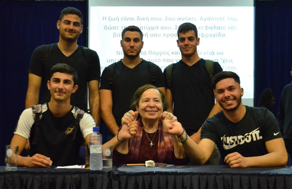Απάντησε στις ερωτήσεις των μαθητών με αμεσότητα, χιούμορ και με συνέπεια στην ανθρωπιά και στο δόσιμο, χαρακτηριστικά τα οποία κάποιος μπορεί να διαβάσει στις σελίδες των είκοσι βιβλίων που έχει, ως τώρα, γράψει.
