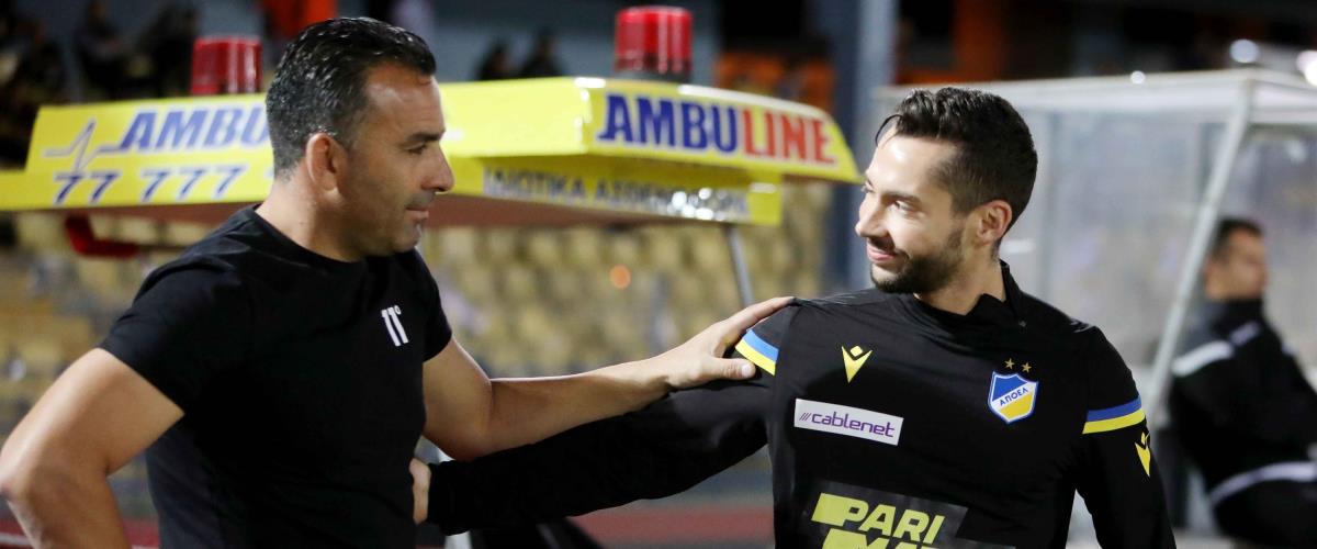 Πριν την έναρξη του μεγάλου ντέρμπι στο Τσίρειο, μεταξύ του Απόλλωνα και του ΑΠΟΕΛ, οι Σωφρόνης Αυγουστή και Αντόνιο Γιάκολις τα είπαν σε πολύ καλό κλίμα.