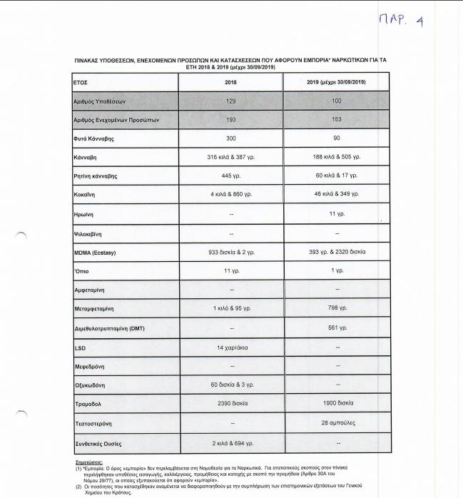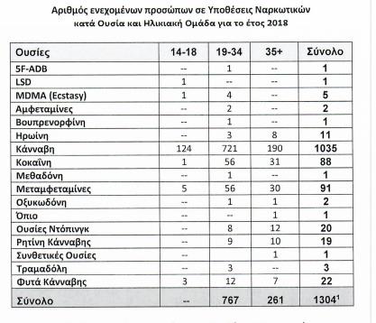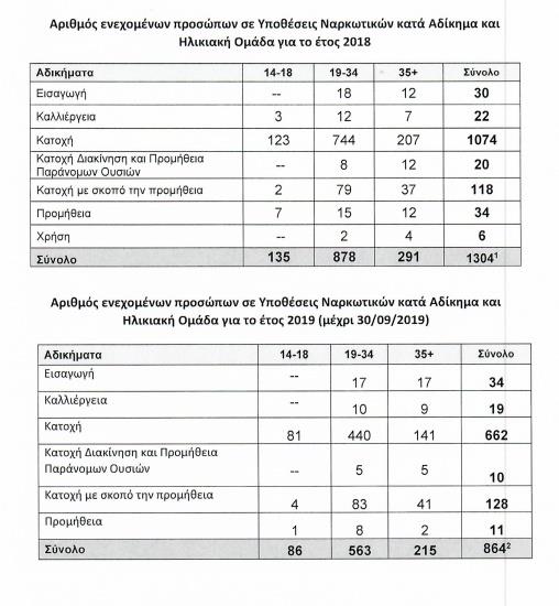 Όπως φαίνεται στους σχετικούς πίνακες, για υποθέσεις κάνναβης την υπό εξέταση διετία συνελήφθησαν συνολικά 1.663 πρόσωπα όλων των ηλικιών (1.035 το 2018 και 628 το 2019), για κοκαϊνη συνελήφθησαν 180 άτομα (88 το 2018 και 92 το 2019), για μεταμφεταμίνες, 159 (91 το 2018 και 68 το 2019), ενώ για ρητίνη κάνναβη συνελήφθησαν 35 πρόσωπα.