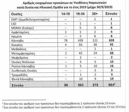 Το 2019 παρατηρείται αρκετά μεγάλη πτώση στις συλλήψεις σε όλες τις ηλικίες. Συγκεκριμένα για κάνναβη και σε ό,τι αφορά τις ηλικίες 19-34, συνελήφθησαν 439 άτομα για κάνναβη, 50 για κοκαϊνη και 42 για μεταμφεταμίνες. Στις ηλικίες 35 και άνω συνελήφθησαν 111 πρόσωπα για κάνναβη, 38 για κοκαϊνη και 24 για μεταμφεταμίνες, ενώ στις ηλικίες 14-18 έγιναν 78 συλλήψεις για κάνναβη, 4 για κοκαϊνη και 2 για μεταμφεταμίνες.