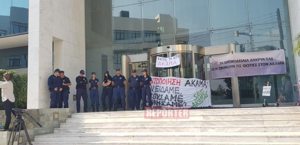 Με πανό και συνθήματα αρκετοί πολίτες μαζεύτηκαν έξω από το Υπουργείο Γεωργίας και διαμαρτύρονται για τον Ακάμα.