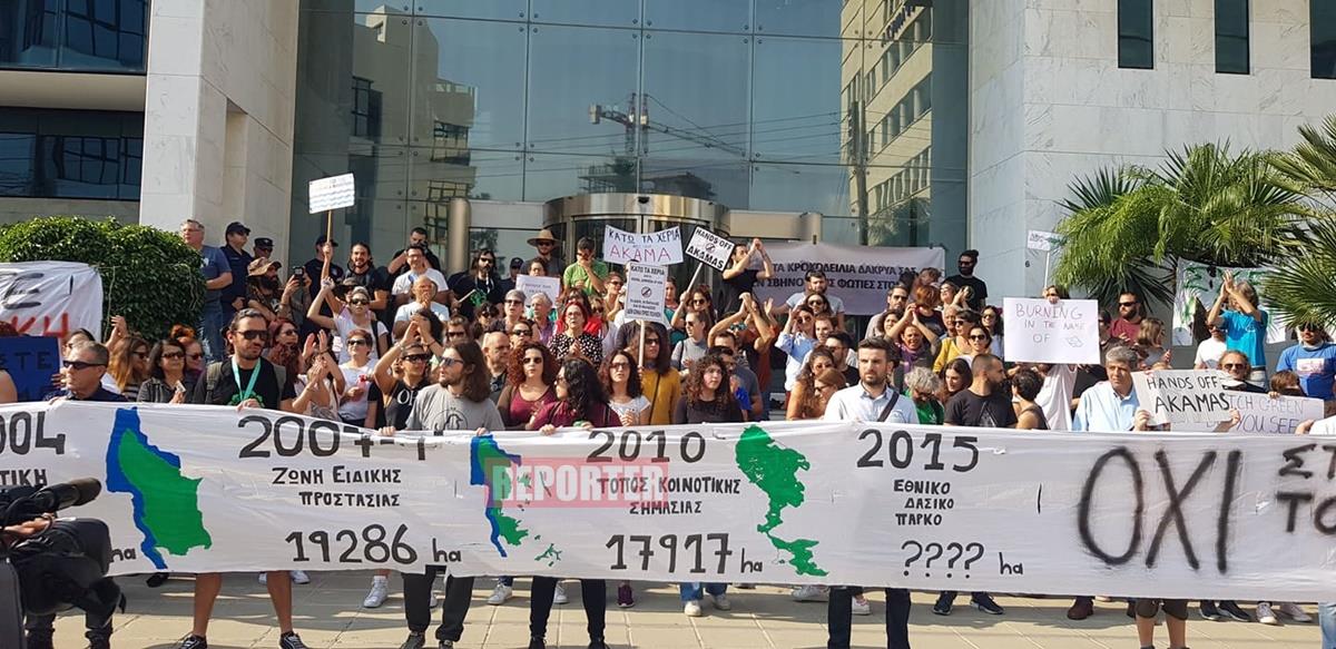 «Κάτω τα χέρια από τον Ακάμα», «Τα κροκοδείλια δάκρυά σας δεν σβήνουν τις φωτιές στον Ακάμα» και με σφυρίκτρες, οι πολίτες διαμαρτυρήθηκαν για την κωλυσιεργία που παρατηρείται από πλευράς αρμοδίων για τη λήψη μέτρων.