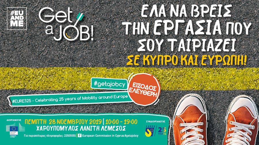 Η Έκθεση “Get a Job” διοργανώνεται και φέτος για 3η συνεχόμενη χρονιά, με σκοπό να βοηθήσει τους νέους να βρουν την εργασία που τους ταιριάζει σε Κύπρο και Ευρώπη. Η Έκθεση θα πραγματοποιηθεί την Πέμπτη 28 Νοεμβρίου 2019 στο Χαρουπόμυλο Λανίτη, από τις 10:00 έως τις 19:00 και διοργανώνεται από την Αντιπροσωπεία της Ευρωπαϊκής Επιτροπής στην Κύπρο και το δίκτυο EURES.