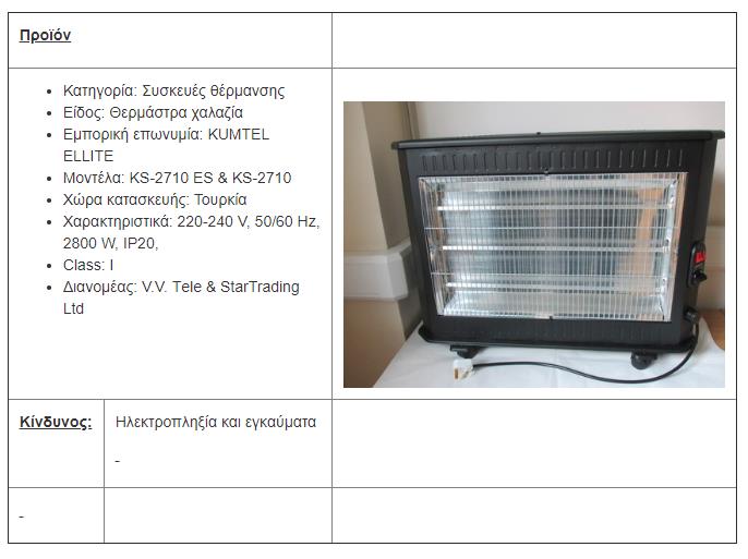 Το Τμήμα Ηλεκτρομηχανολογικών Υπηρεσιών, πληροφορεί το καταναλωτικό κοινό ότι έχει εντοπίσει στην αγορά το πιο κάτω προϊόν, το οποίο δε συμμορφώνεται με τις βασικές απαιτήσεις ασφάλειας της οδηγίας για τον Ηλεκτρολογικό Εξοπλισμό Χαμηλής Τάσης (LVD), αφού εμπερικλείει ουσιαστικούς κινδύνους ασφάλειας για τον χρήστη. Ως εκ τούτου, ο διανομέας έχει προβεί σε εθελοντική απόσυρσή του από την αγορά.