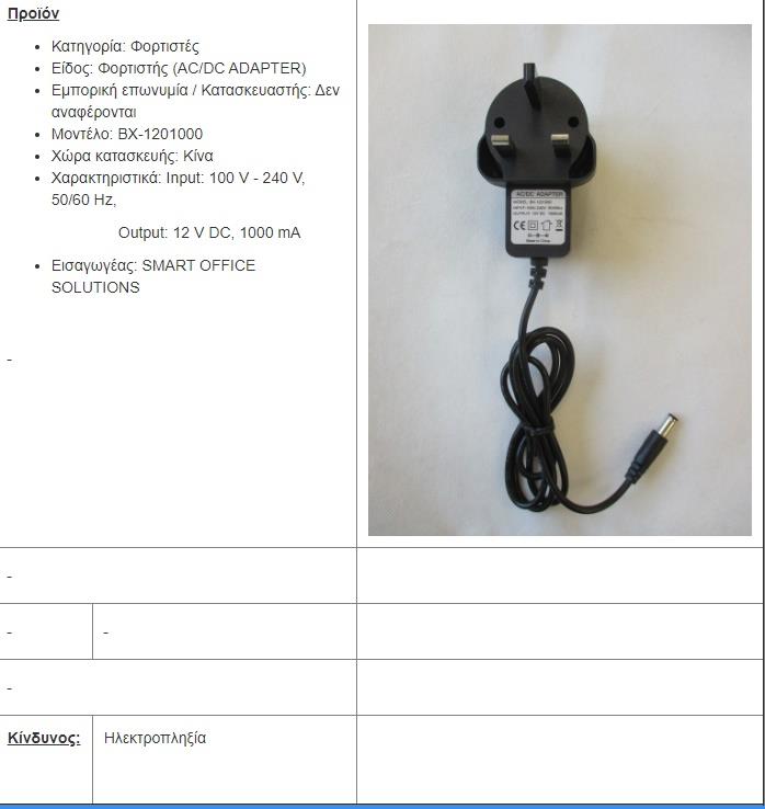 Το Τμήμα Ηλεκτρομηχανολογικών Υπηρεσιών πληροφορεί το καταναλωτικό κοινό ότι έχει εντοπίσει στην αγορά φορτιστή, ο οποίος δεν συμμορφώνεται με τις βασικές απαιτήσεις ασφάλειας αφού εμπερικλείει ουσιαστικούς και σοβαρούς κινδύνους για τον χρήστη.
