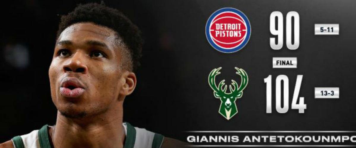 Ο «Greek Freak» είχε 28 πόντους με 3/9 βολές, 11/19 δίποντα, 1/3 τρίποντα, 10 ριμπάουντ, τρεις ασίστ, ένα κλέψιμο και δύο κοψίματα, με τους Μπακς να ξεφεύγουν από τους Πίστονς στα πρώτα λεπτά της τέταρτης περιόδου όταν τους κράτησαν... άποντους για τα πρώτα 5' και 30΄΄ και την διαφορά να πηγαίνει στους 20 πόντους (89-69).