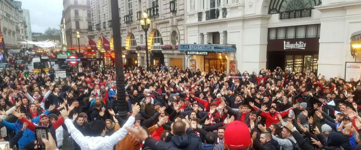 Εντυπωσιακή ήταν η παρουσία των οπαδών του Ολυμπιακού στη Piccadilly Circus. Οι οπαδοί των ερυθρολεύκων έδωσαν ραντεβού στη γνωστή πλατεία του Λονδίνου για να πορευτούν όλοι μαζί προς το γήπεδο της Τότεναμ για το αποψινό ματς.