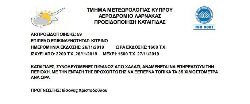 Λόγω των καταιγίδων που αναμένεται να πλήξουν διάφορες περιοχές του νησιού, η μετεωρολογική υπηρεσία εξέδωσε κίτρινη προειδοποίηση.