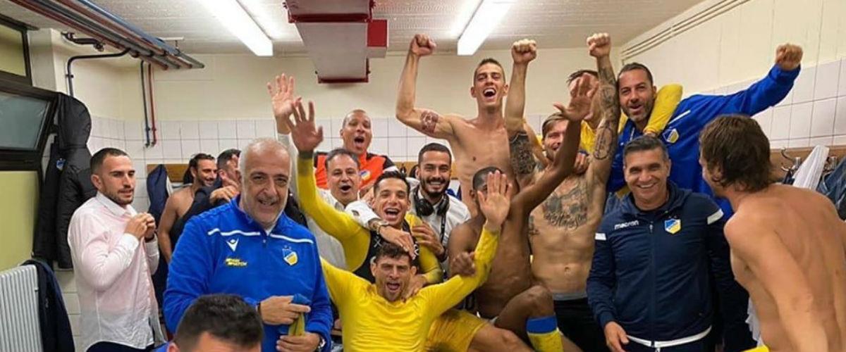 Με την ψυχή τους χάρηκαν την πρόκριση στους 32 του Γιουρόπα Λιγκ στ' αποδυτήρια οι παίκτες του ΑΠΟΕΛ μετά το τέλος του ματς με την Ντουντελάνζ.
