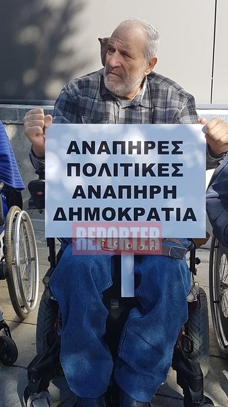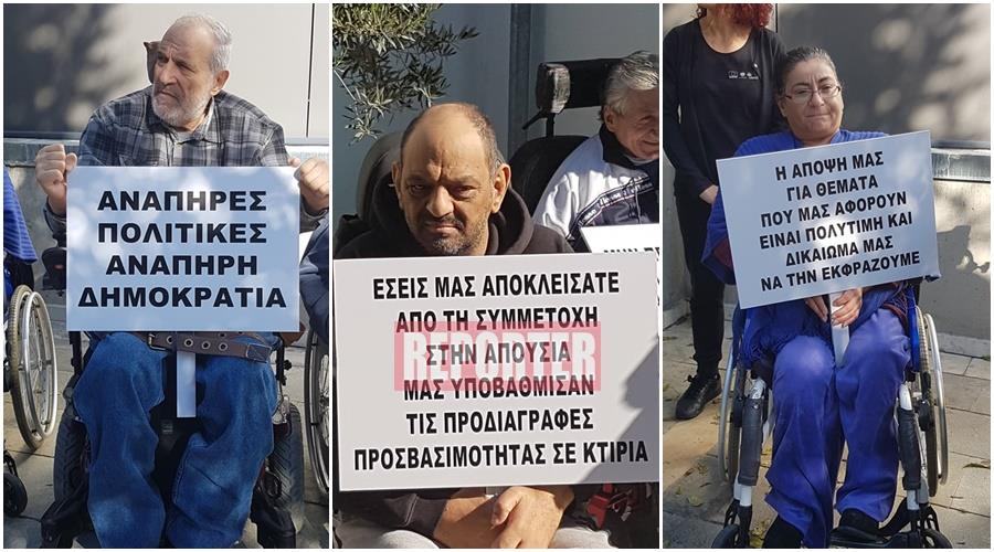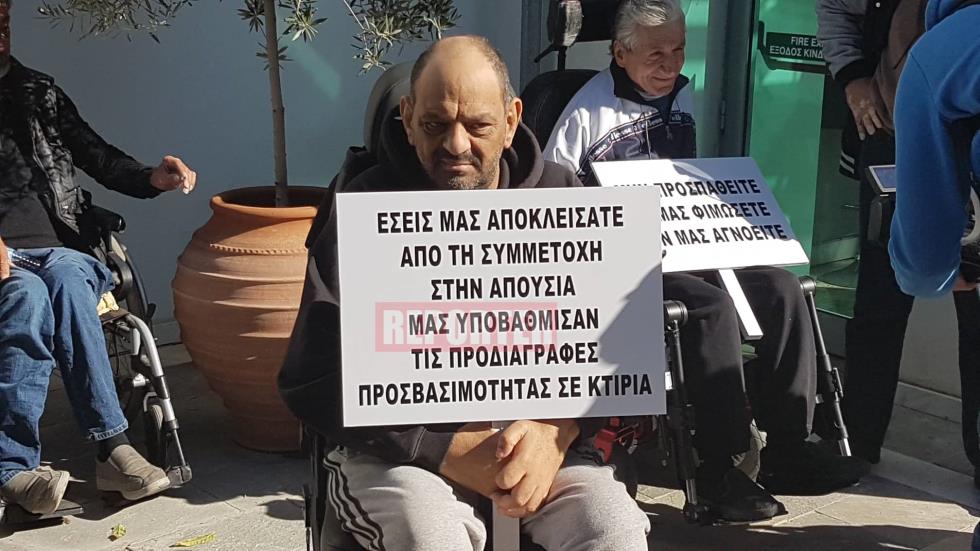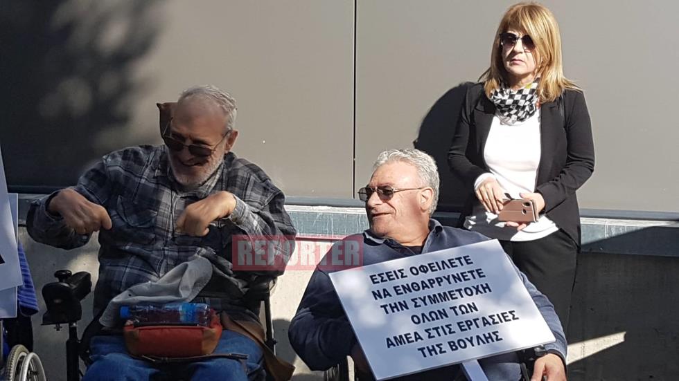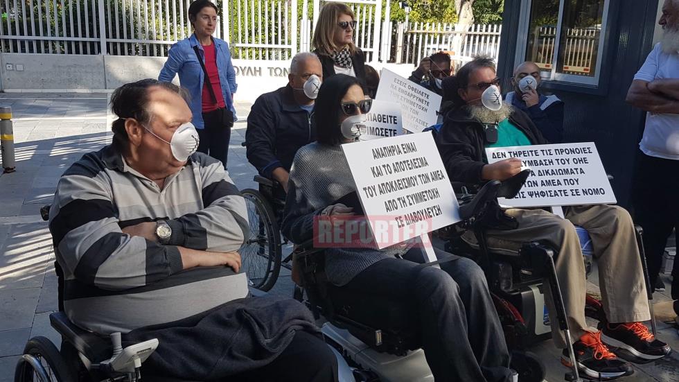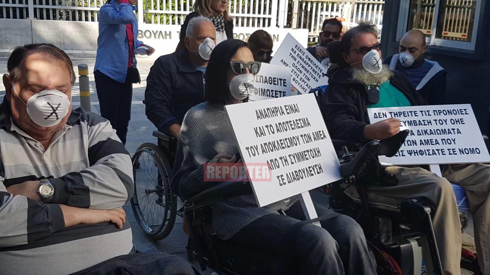 Με πλακάτ και μάσκες, τα μέλη της ΟΠΑΚ διαμαρτυρήθηκαν για το γεγονός πως η Κοινοβουλευτική Επιτροπή Εσωτερικών δεν διασφάλισε την εξυπηρέτηση του δικαιώματος της να συμμετέχει εκεί που αποφασίζουν για σημαντικά θέματα που τους αφορούν όπως η προσβασιμότητα στα κτίρια και το περιβάλλον.
