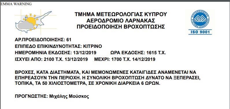Η Μετεωρολογική Υπηρεσία εξέδωσε κίτρινη προειδοποίηση, η οποία βρίσκεται ήδη σε ισχύ.
