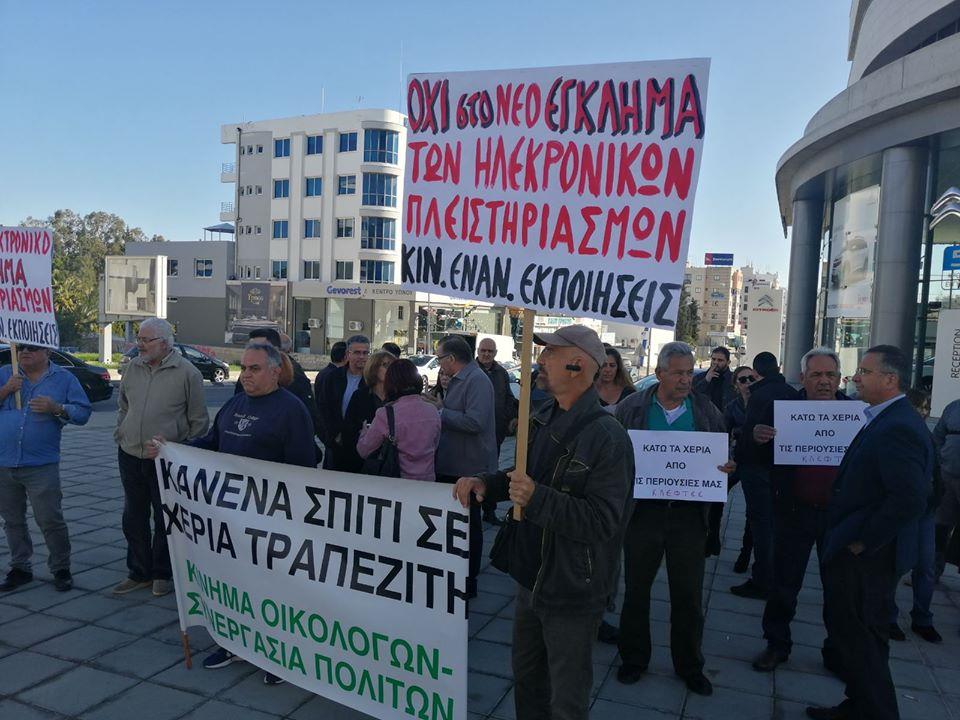 «Όχι στο νέο έγκλημα των ηλεκτρονικών πλειστηριασμών» και «Κανένα σπίτι σε χέρια τραπεζίτη» ήταν κάποια από τα συνθήματα που αναγράφονταν στα πλακάτ που κρατούσαν όσοι συγκεντρώθηκαν έξω από τα γραφεία του Συνδέσμου Τραπεζών, στη Λευκωσία, για να διαμαρτυρηθούν κατά του νέου μέτρου των ηλεκτρονικών πλειστηριασμών.