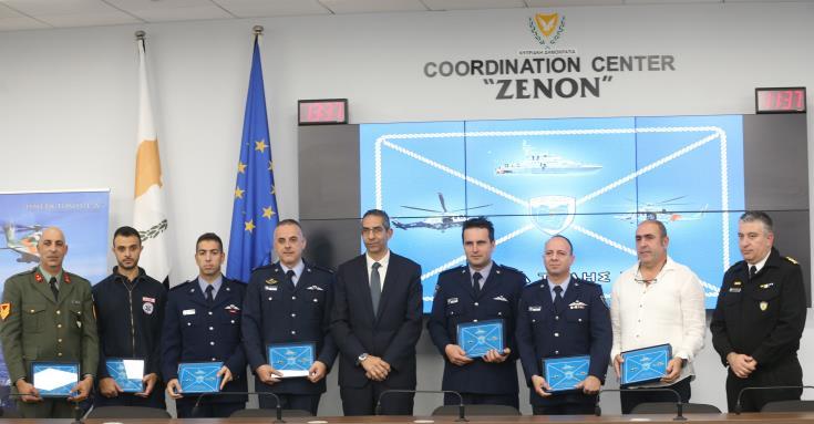 Στη συνέχεια ο Υπουργός Άμυνας βράβευσε το πλήρωμα του ελικοπτέρου, συνολικά πέντε άτομα, που συμμετείχαν σε επιχείρηση αεροδιακομιδής ασθενούς από πλατφόρμα εταιρείας υδρογονανθράκων στις 2 Ιανουαρίου, ένα στρατιωτικό ο οποίος έδρασε εθελοντικά και μετείχε στη διάσωση αγνοούμενων ατόμων στη θαλάσσια περιοχή Περνέρας στο Παραλίμνι και ιδιώτη εθελοντή ο οποίος εγκατέστησε Σωστικό Σημείο στη περιοχή των Αγίων Αναργύρων στο Κάβο Γκρέκο.