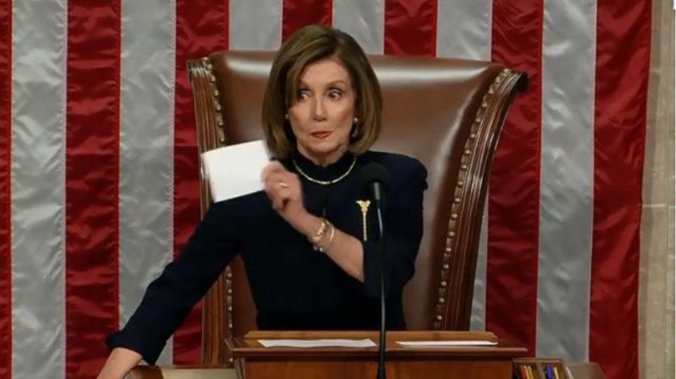 Σε ένα στιγμιότυπο της χθεσινής ψηφοφορίας στη Βουλή των Αντιπροσώπων, κατά την οποία ελήφθη η ιστορική απόφαση της παραπομπής του Ντόναλντ Τραμπ σε δίκη στη Γερουσία, η πρόεδρος του σώματος εμφανίζεται να «κόβει» με μια χειρονομία και ένα παγωμένο βλέμμα μερικά σποραδικά χειροκροτήματα από την πλευρά των Δημοκρατικών στην αίθουσα. Σύμφωνα με την Guardian, η σκηνή σημειώθηκε μετά την ανακοίνωση από την ίδια του τελικού αποτελέσματος της ψηφοφορίας για την απαγγελία της πρώτης από τις δύο «κατηγορίες» σε βάρος του Αμερικανού προέδρου, εκείνη δηλαδή που αφορά στην κατάχρηση εξουσίας.