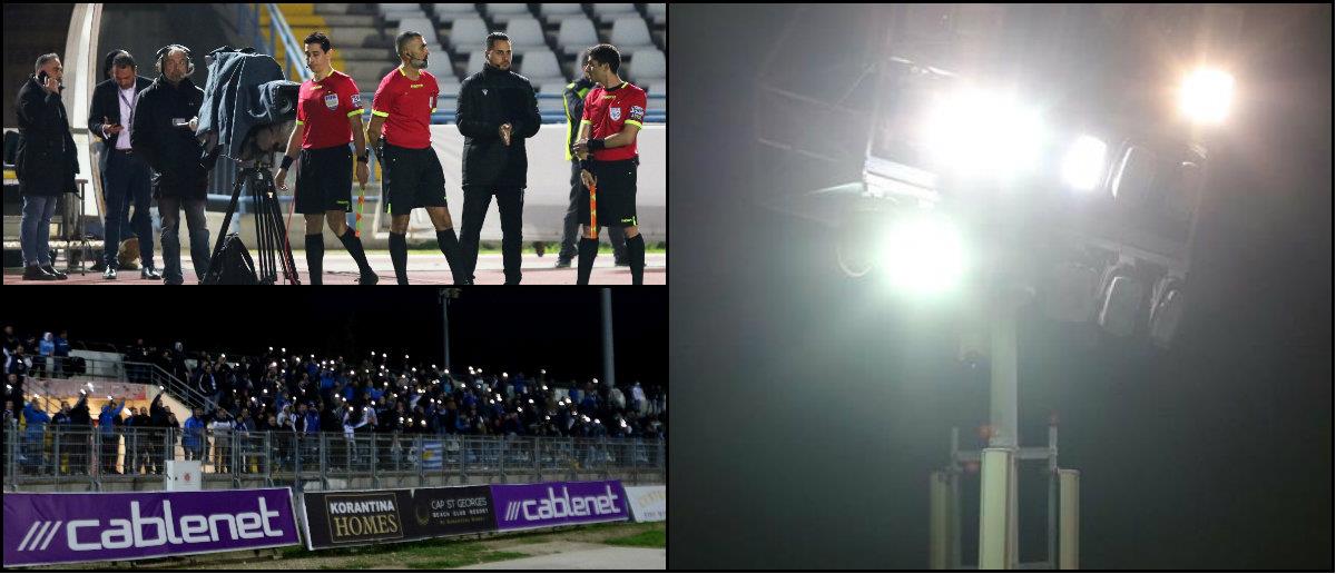 Συγκεκριμένα, λίγα λεπτά μετά τη σέντρα, ο διαιτητής της αναμέτρησης, Γιώργος Νικολάου, διέκοψε για μερικά λεπτά τον αγώνα μέχρι να γίνει επανεκκίνηση στον συγκεκριμένο προβολέα.