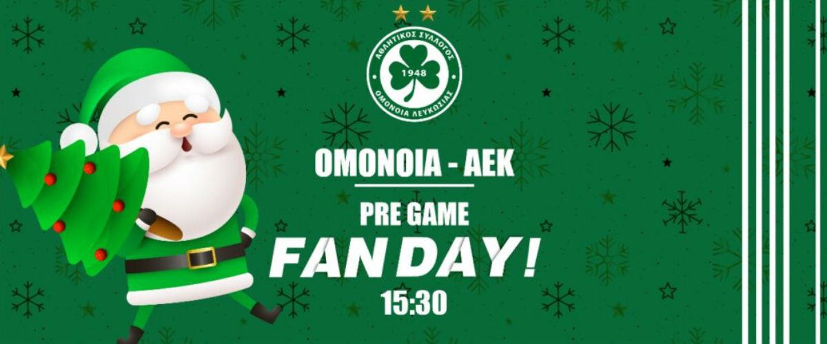 Ενημερώνει η Ομόνοια για το Fan Day που θα διεξαχθεί πριν το μεγάλο ντέρμπι με την ΑΕΚ παρέα με τον Πράσινο Άγιο Βασίλη, ο οποίος θα μοιράσει δώρα μικρά παιδιά.