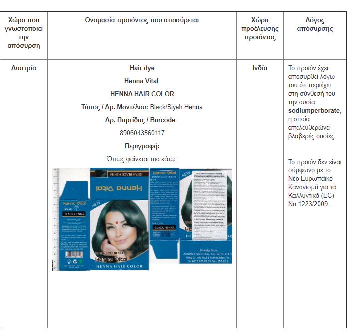 Το Δίκτυο Ταχείας Ανταλλαγής Πληροφοριών (RAPEX), στην τελευταία γνωστοποίησή του, ενημερώνει τα κράτη μέλη, ότι στην Ευρώπη έχει εντοπισθεί και αποσυρθεί το πιο κάτω καλλυντικό προϊόν: