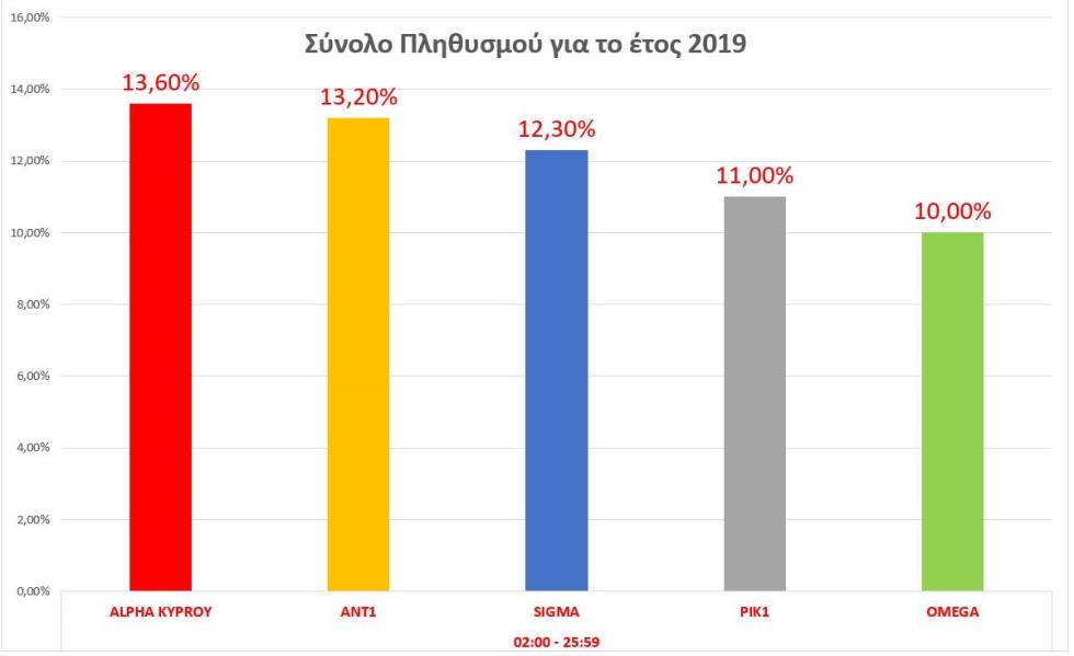 Σύμφωνα με τα επίσημα στοιχεία της AGB, πρώτο σε τηλεθέαση κανάλι για ολόκληρο το 2019 σε Σύνολο Πληθυσμού (TOTAL) ήταν ο ALPHA Κύπρου με ποσοστό 13,6%, στην δεύτερη θέση ήταν ο ΑΝΤ1 με 13,2%, στην τρίτη θέση ήταν το ΣΙΓΜΑ με 12,3%, στην τέταρτη θέση ήταν το ΡΙΚ με 11%, ενώ στην πέμπτη θέση ήταν το OMEGA με 10%.