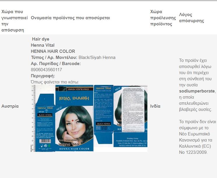 Καλλυντικό προϊόν αποσύρεται από την ευρωπαϊκή αγορά. Σύμφωνα με το Δίκτυο Ταχείας Ανταλλαγής Πληροφοριών (RAPEX) "δεν υπάρχουν σαφείς πληροφορίες αναφορικά με τις χώρες εξαγωγής του και για τον λόγο αυτό οι Φαρμακευτικές Υπηρεσίες διεξάγουν έρευνα για τον εντοπισμό τoυ".