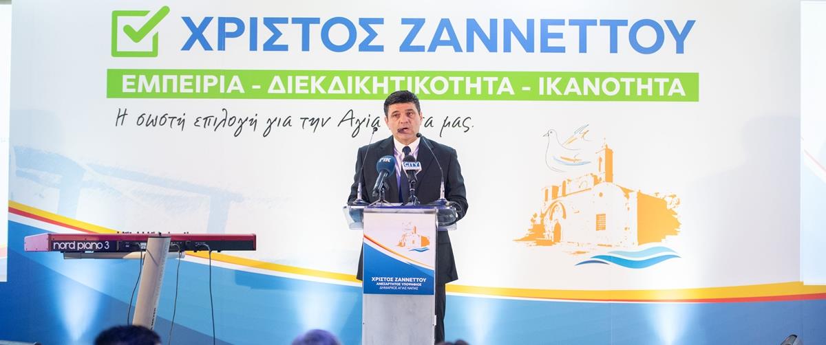 Σε γραπτή ανακοίνωση αναφέρεται ότι κατά την τελική προεκλογική του συγκέντρωση που πραγματοποιήθηκε χθες βράδυ σε παραλιακό ξενοδοχείο της Αγίας Νάπας, ο κ. Ζαννέττου ανέφερε ότι «είμαι έτοιμος να συνεχίσω να δουλεύω ακούραστα και με όλες μου τις δυνάμεις, ώστε ο Δήμος μας να φτάσει σε ακόμα υψηλότερα επίπεδα ποιότητας και πρωτοπορίας, εδραιώνοντας τη θέση του στον παγκόσμιο τουριστικό χάρτη». Ο υποψήφιος δήμαρχος «ευχαρίστησε εκ βάθους καρδιάς τους ομιλητές και όλους τους παρευρισκόμενους για την παρουσία τους και όσους εργάστηκαν σκληρά για τον προεκλογικό» του αγώνα ενώ ανέλυσε το όραμα και τις θέσεις του για το μέλλον της Αγίας Νάπας.