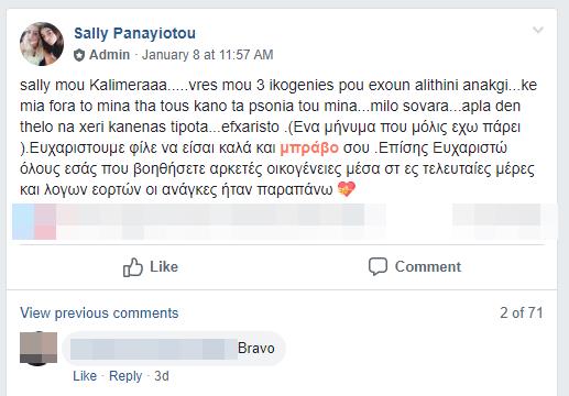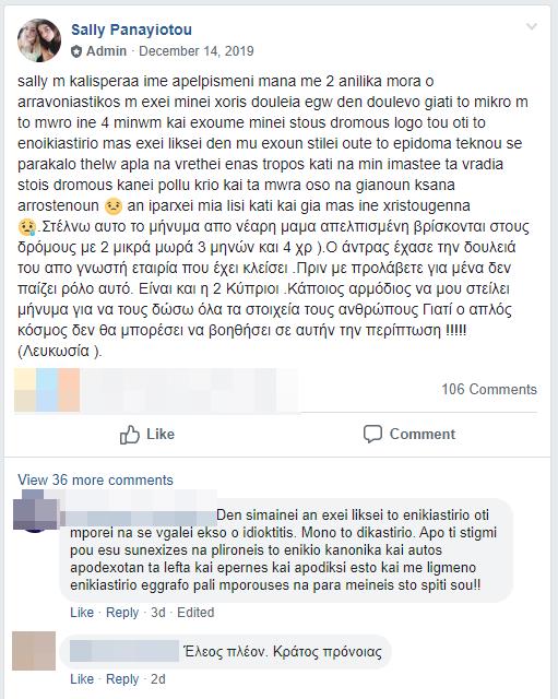 «Είναι μια οικογένεια από την Πάφο, η μητέρα δεν εργάζεται και το ένα παιδί είναι ΑμεΑ και έχει και σύνδρομο Down. Το παιδί είχε πρόβλημα με την καρδία του και χρειάστηκε να κάνει επεμβάσεις. Ο πατέρας δουλεύει σε οικοδομή και απουσίαζε πολλές φορές, επειδή το παιδί βρισκόταν στο νοσοκομείο. Η οικογένεια, επειδή δεν μπορούσε να έρθει Λευκωσία, ακύρωσε δύο φορές ραντεβού στον γιατρό, αλλά έπρεπε να έρθει, επειδή κανόνιζαν χειρουργείο. Θα ακύρωναν και πάλι ραντεβού επειδή το ταξί για να φέρει τη μητέρα ζήτησε 160 ευρώ, ενώ αυτή είχε 50 ευρώ για να περάσει τον μήνα. Όταν το μάθαμε, εμείς κάναμε ανάρτηση στην ομάδα μας και ξεσηκώθηκε ο κόσμος και άρχισαν οι εθελοντές να προσφέρονται ποιος θα το πληρώσει. Βρέθηκε μάλιστα και εθελοντής που προσφέρθηκε να πάει Πάφο και να έρθει και το έπραξε. Βρέθηκε και ψησταριά που προσφέρθηκε να τους ετοιμάσει φαγητό να φάνε», σημείωσε η κ. Παναγιώτου.