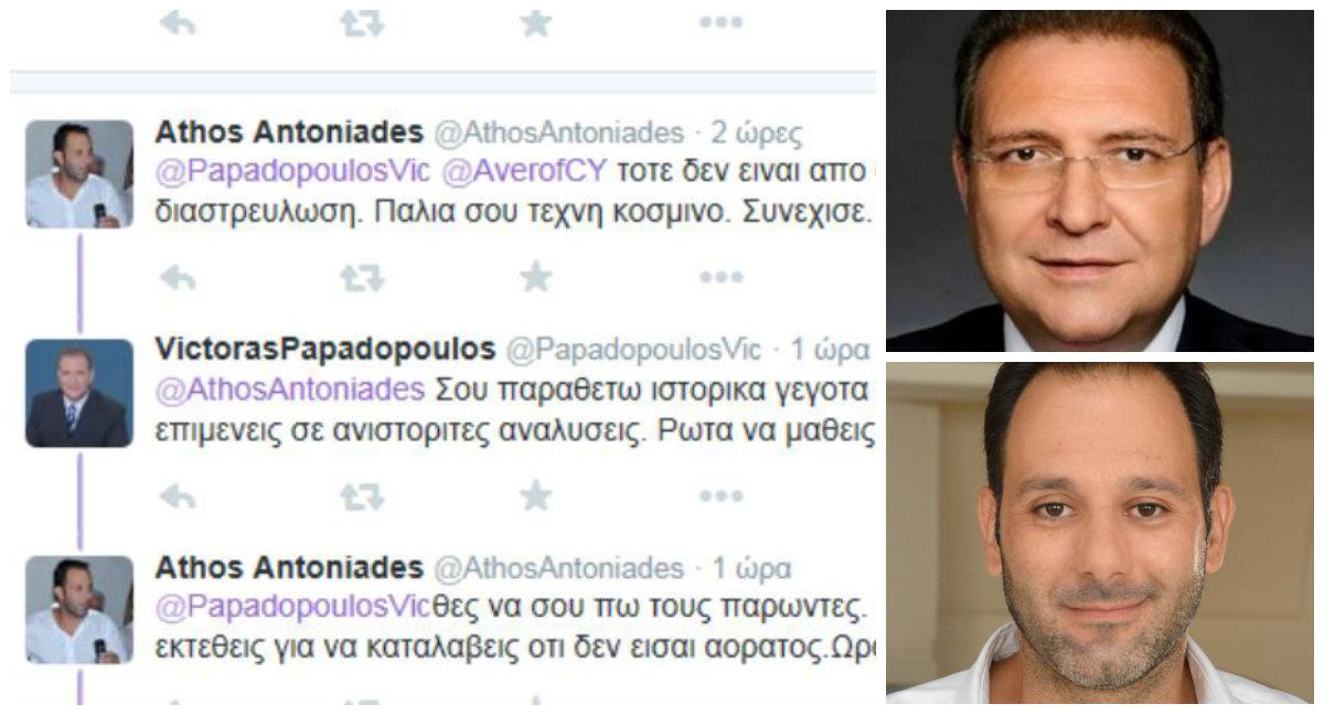 Tις πολιτικές τους διαφορές μέσω twitter επέλεξαν να λύσουν ο Εκπρόσωπος Τύπου του ΔΗΚΟ Άθως Αντωνιάδης και ο Κυβερνητικός Εκπρόσωπος Βίκτωρας Παπαδόπουλος.