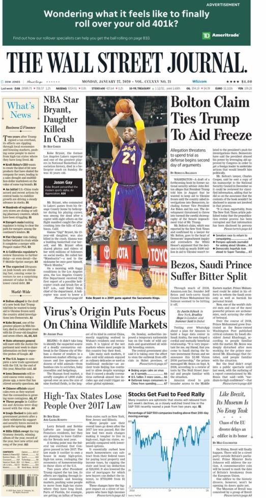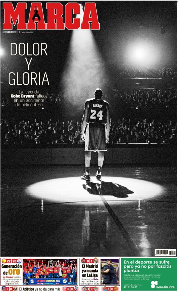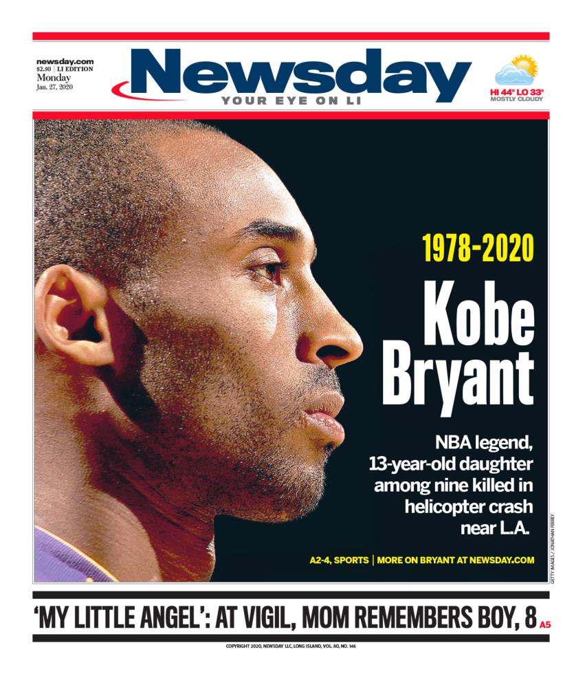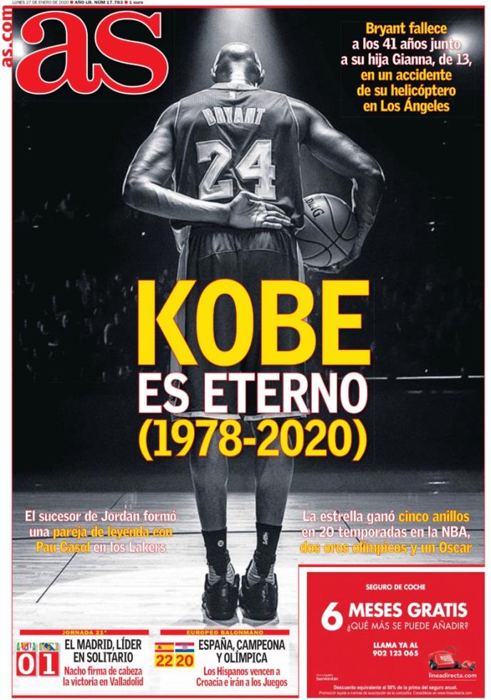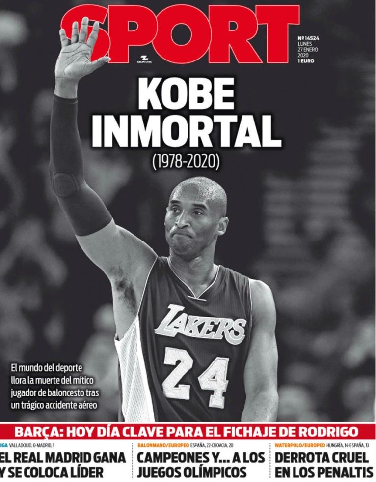Ασφαλώς και είναι το θέμα της ημέρας και των ημερών που θ' ακολουθήσουν, με τον διεθνή Τύπο ν' αφιερώνει ολόκληρα πρωτοσέλιδα στη μνήμη του Κόμπι Μπράιαντ, ως ένδειξη του αδιανόητου αντίκτυπου που είχε ο θρύλος του NBA...