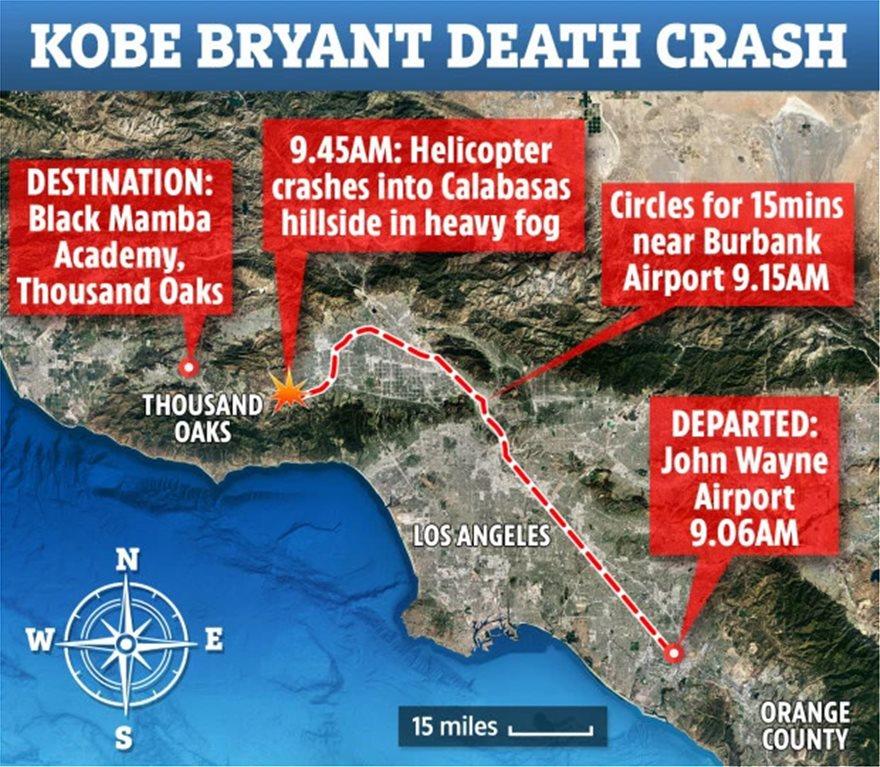 Το ελικόπτερο στο οποίο επέβαινε ο Κόμπι Μπράιαντ και άλλα 8 άτομα απογειώθηκε από το αεροδρόμιο John Wayne του Orange County, στην Καλιφόρνια, το πρωί της Κυριακής και ώρα τοπική 9:06. Με πορεία προς τα βορειοδυτικά, ο τελικός προορισμός ήταν η Ακαδημία Mamba Sports του Μπράιαντ, στο Νιούμπουρι Παρκ. Θα διέσχιζε τον εναέριο χώρο του Λος Άντζελες, ζητήθηκε όμως από τον πιλότο να κάνει κύκλους πάνω από το Γκλεντέιλ, προκειμένου να δώσει τη δυνατότητα σε ένα αεροσκάφος να προσγειωθεί σε κοντινό αερολιμένα. Το ελικόπτερο ακολούθως συνέχισε την πορεία του προς ΒΔ, πριν αλλάξει κατεύθυνση προς νότο.