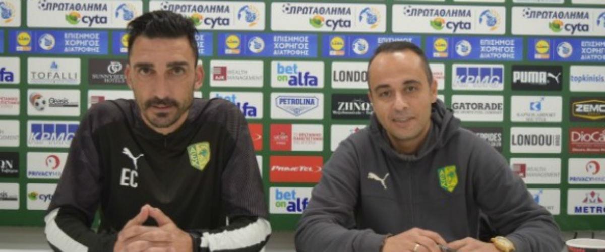 Η δημοσιογραφική διάσκεψη πραγματοποιήθηκε στην αίθουσα διασκέψεων του AEK ARENA και μίλησε ο προπονητής των Λαρνακέων, Ηλίας Χαραλάμπους και o Άμπραχαμ Γκονσάλες.