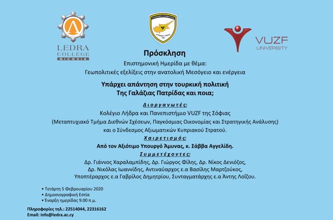Συνέδριο με τον τίτλο «Υπάρχει απάντηση στην τουρκική πολιτική της Γαλάζια Πατρίδας και ποια; Γεωπολιτικές εξελίξεις στην ανατολική Μεσόγειο και ενέργεια», διοργανώνουν την Τετάρτη, στις 9:00 το πρωί μέχρι τις 2:00 το μεσημέρι, το Κολέγιο Λήδρα, το Πανεπιστήμιο VUZF της Σόφιας (Μεταπτυχιακό Τμήμα Διεθνών Σχέσεων, Παγκόσμιας Οικονομίας και Στρατηγικής Ανάλυσης) και ο Σύνδεσμος Αξιωματικών Κυπριακού Στρατού.