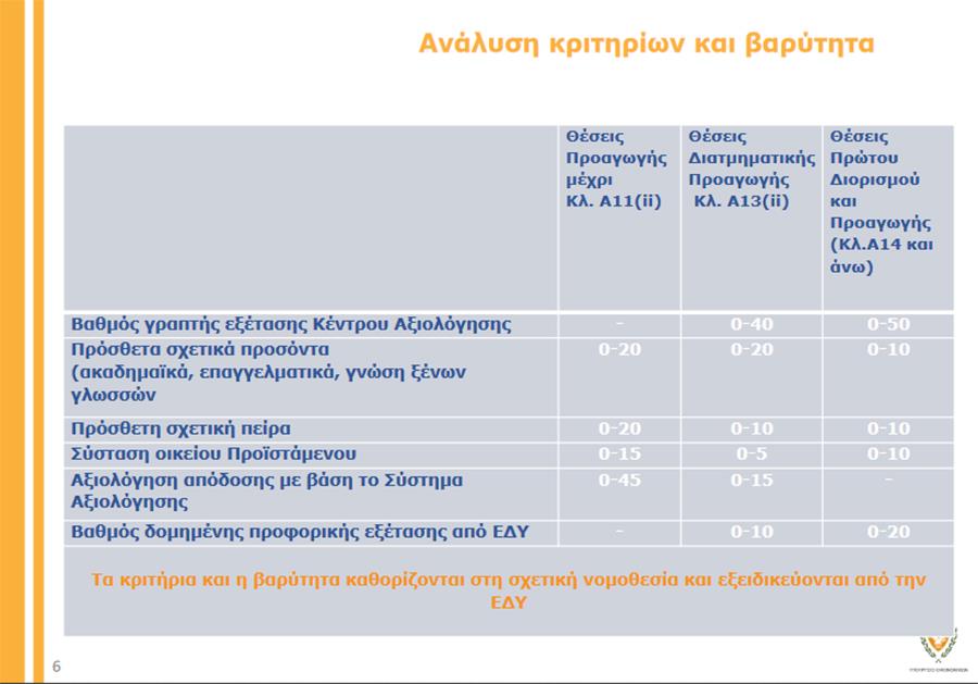 - Προφορική εξέταση από ΕΔΥ, η οποία θα έχει βαρύτητα 15% για την πλήρωση θέσεων Α13(ii) και 20% βαρύτητα για τις θέσεις Α14 και άνω.