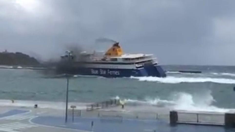 Το Blue Star Naxos πραγματοποίησε μία εντυπωσιακή «μανούβρα», προκειμένου να καταφέρει να προσδέσει στο λιμάνι της Τήνου, εν μέσω κακοκαιρίας.