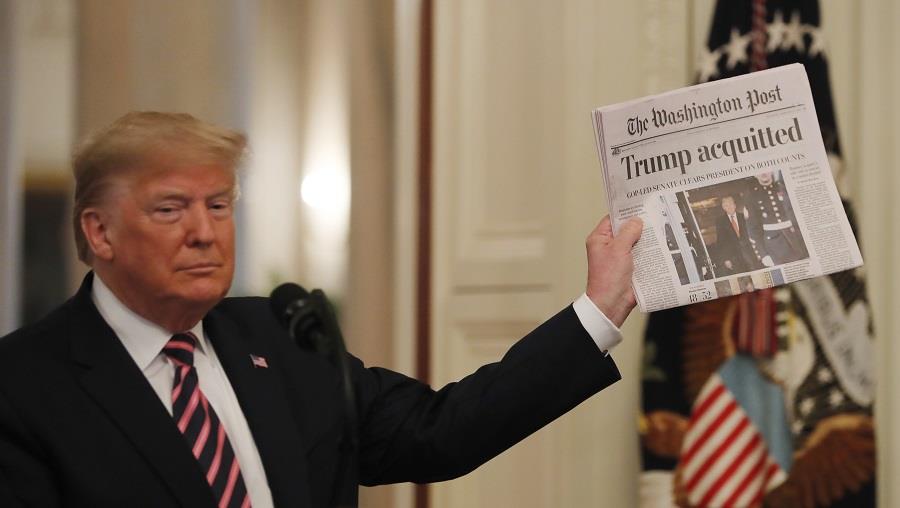 Την επομένη της αθώωσής του από την Γερουσία, στο τέλος της δίκης για την καθαίρεσή του, ο Αμερικανός πρόεδρος επανήλθε στους γνωστούς μύδρους εναντίον πολιτικών του αντιπάλων, τους οποίους και κατηγόρησε για «ανεντιμότητα» και «διαφθορά».